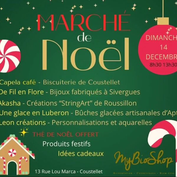 Dimanche 14 de 8h30 à 13h30 : Marché de Noël devant MyBioshop à Coustellet